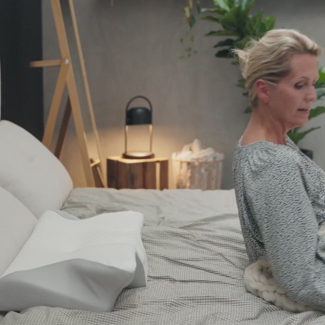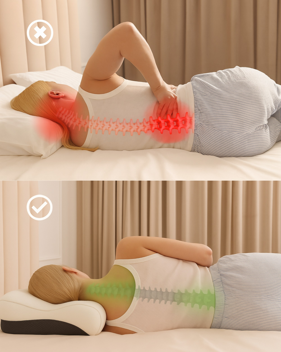It starts with your old pillow forcing your spine out of alignment all night long . As your head sinks and moves, muscle tension builds up from your neck down into your lower back.